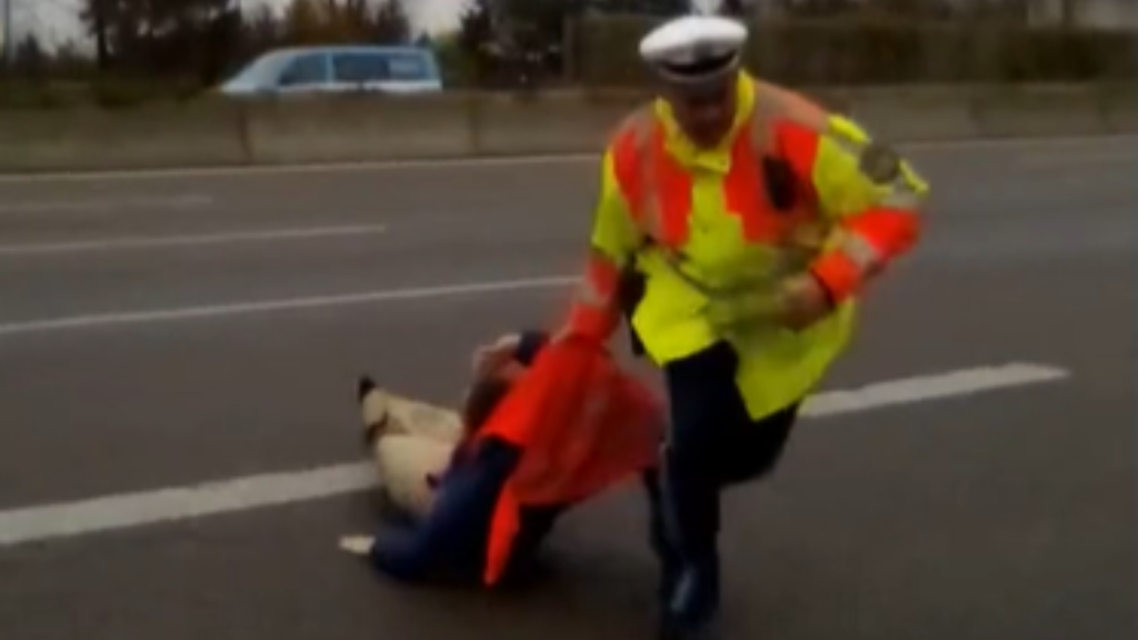 Op een drukke dag stapte een vrouw, herkenbaar aan een felgekleurde jas, uit en hield lijm bij zich met de intentie die op de weg te gebruiken. Voordat zij zich kon vastplakken sprong een agent uit zijn dienstwagen, greep haar kordaat bij de kraag en duwde haar naar de berm. De agent sprak in duidelijke, strenge bewoordingen en gaf een bijna bevelende instructie om achter de vangrail te blijven; volgens beelden en getuigen was er geen ruimte voor discussie.