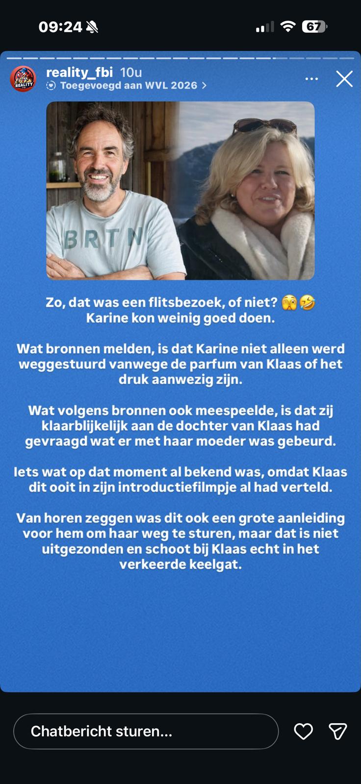 De discussie begon niet op tv, maar online toen een populair roddelaccount een Story plaatste over het korte bezoek van Karine aan Klaas. De post suggereerde dat er achter de schermen meer speelde dan toeschouwers konden zien en dat trok onmiddellijk aandacht.
